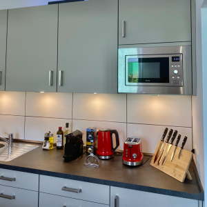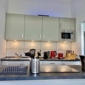 Die Küche hat einen Kühlschrank mit Eisfach, Backofen / Herd und Mikrowelle, Kaffeemaschine und Wasserkocher und allen nötigen Küchenutensilien. Kaffee, Tee und ein paar kühle Begrüßungsgetränke gehören selbstverständlich dazu.